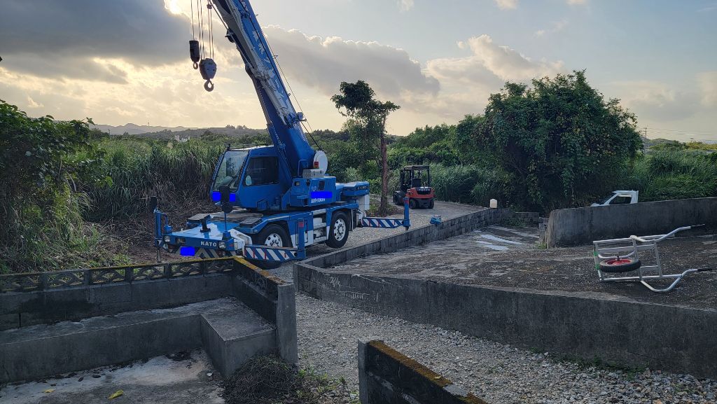 O家之墓連棟新築工事!大型クレーンで安全・確実に施工!沖縄本島北部、美しい海に囲まれた瀬底島で、O家之墓新築工事をスタートいたしました!観光客で賑わい、多くのレンタカーが行き交うこの瀬底島で、熟練の石工職人が、クレーンオペレーターと密に連携を取りながら、一つひとつの部材を丁寧に、そして確実に組み上げてまいります。