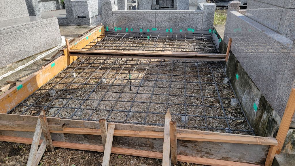 お仕事でお忙しい中、施主のS様に現場の状況を直接ご確認いただく時間をいただき、基礎の配筋の組み方など、細部にわたってご覧いただきました。墓石を支えるための大切な土台工事が、無事に完了!これで、いよいよ次の工程へと進みます。