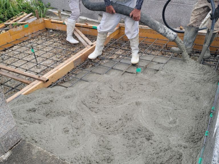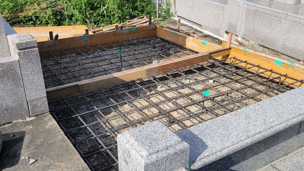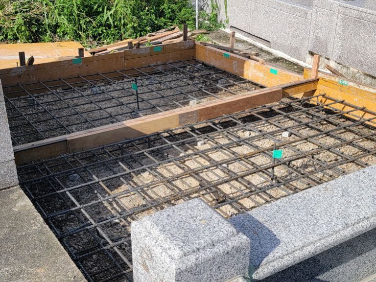 お仕事でお忙しい中、施主のS様に現場の状況を直接ご確認いただく時間をいただき、基礎の配筋の組み方など、細部にわたってご覧いただきました。墓石を支えるための大切な土台工事が、無事に完了!これで、いよいよ次の工程へと進みます。