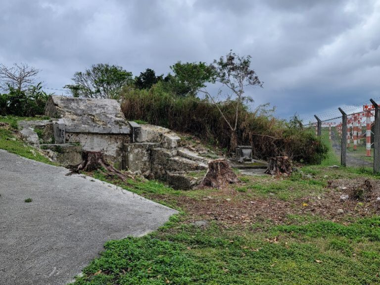 基地のフェンス越しに見る「学び」の光景・・・・作業前、私たちはお墓のすぐそばで、少し目を引く光景に出会いました。それは、普天間飛行場の基地を隔てるフェンスの外側。30人あまりの団体が、基地内をじっと見つめながら、ガイドの方の説明に熱心に耳を傾けていました。服装や様子から察するに、県外から訪れた高校生の皆さんのようでした。