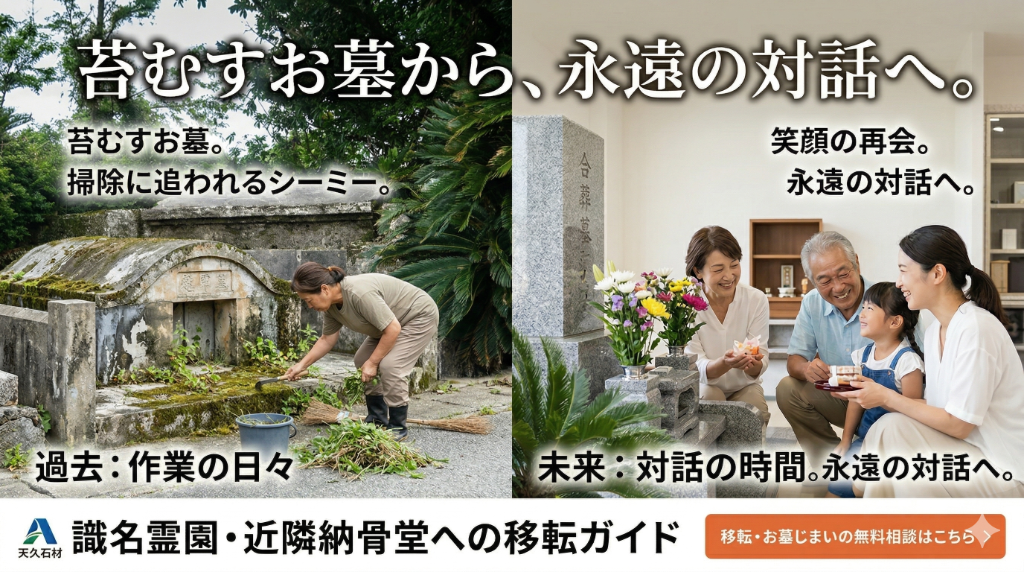 「掃除」からの解放: 識名霊園内にある「那覇市民共同墓」や、近隣の「民間納骨堂」へ移転することで、草むしりやひび割れの補修といった重労働から卒業できます。