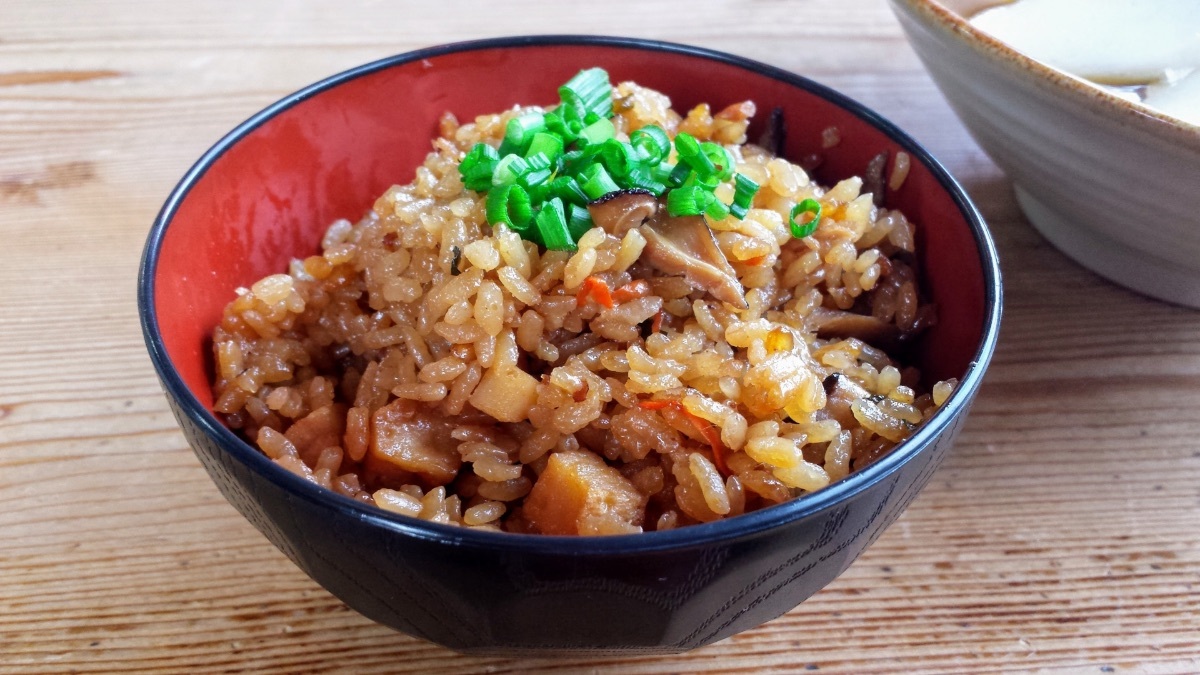 洗って水につけておいたお米に、細かく切って炒め、味付けした具材を混ぜ、塩と出汁で味を整えたら炊飯器で炊きます。フーチバーを入れる際は後入れです。